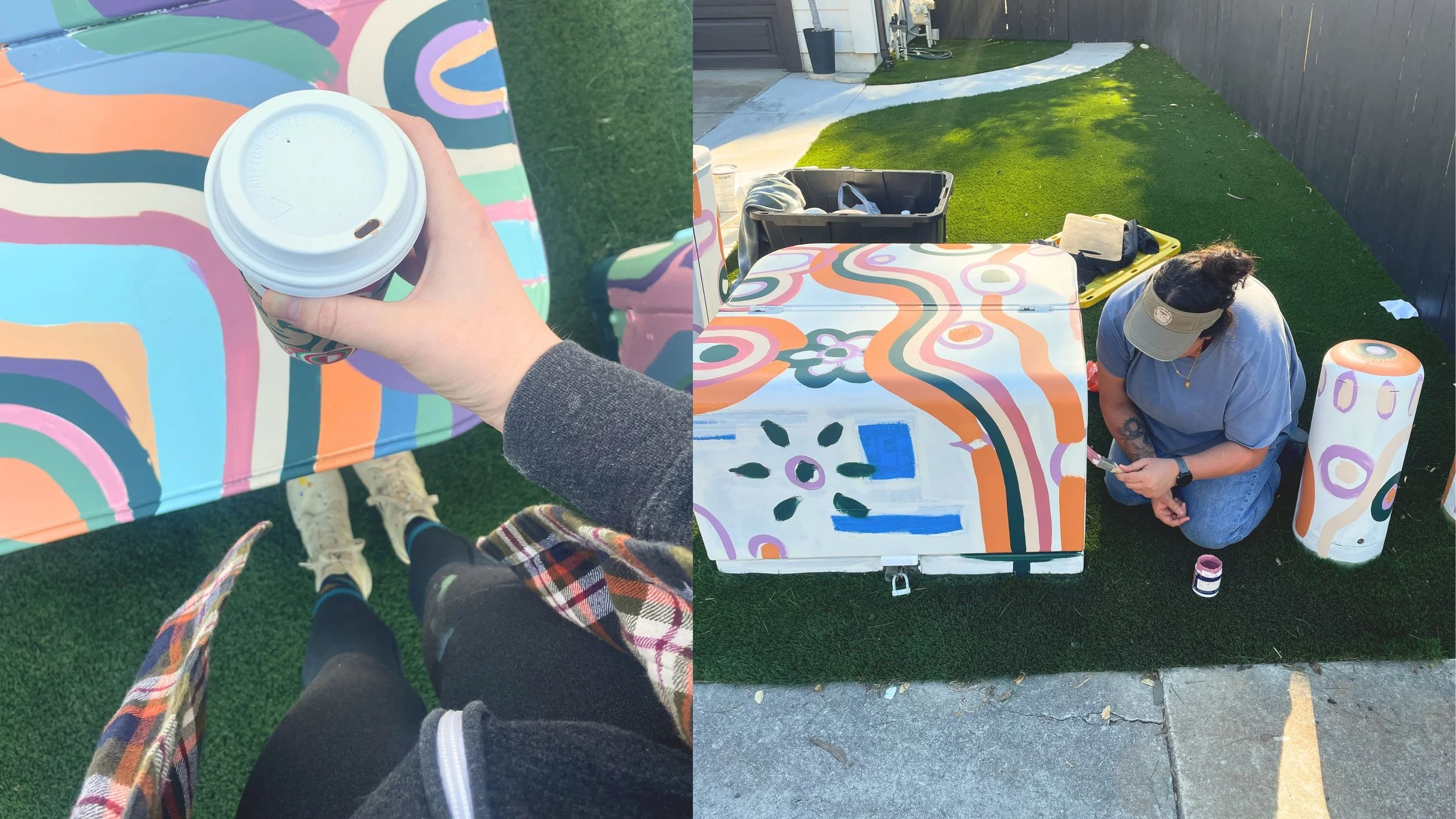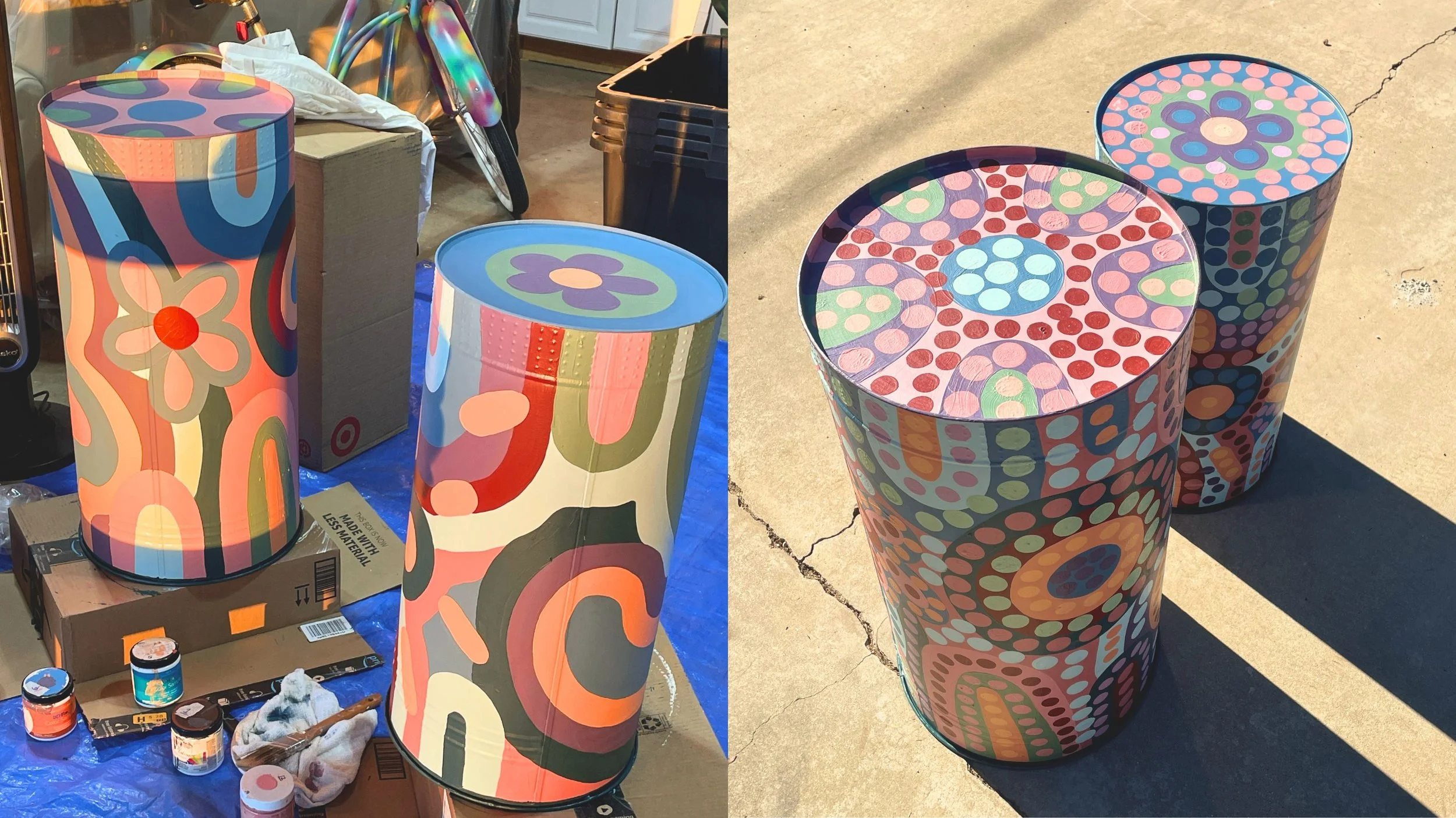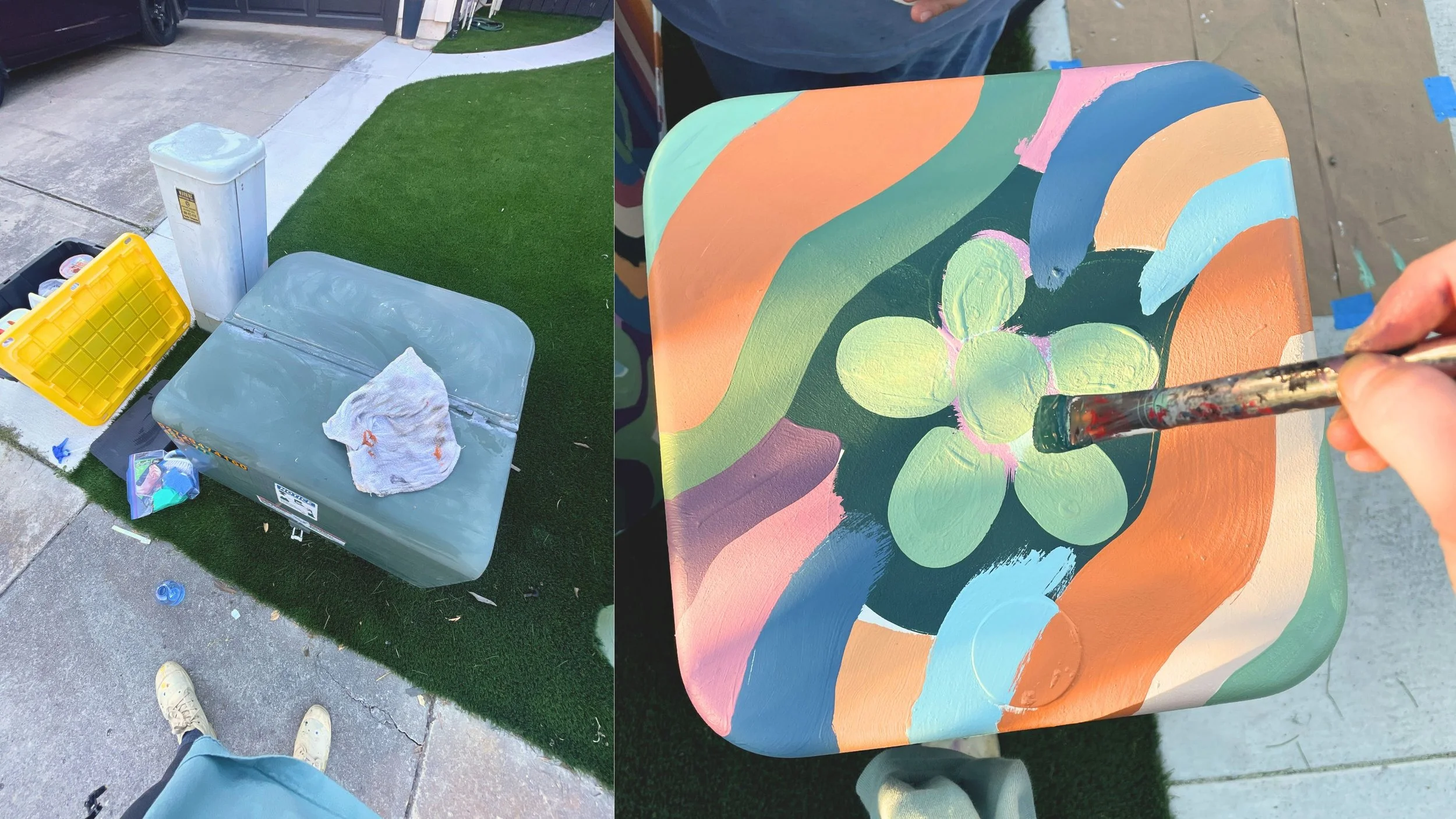 They were thrilled with the outcome, which always makes the hours of painting worth it! Like I mentioned earlier, they loved the design so much that they also gave me two aluminum cans to paint with the same pattern. Since the utility boxes were on the right side of their yard, they wanted to balance the color on the left side. I took the cans home over winter break, and—full honesty—it took me way longer than two days to finish them because I was also watching ✨Love Island✨. Priorities, you know?