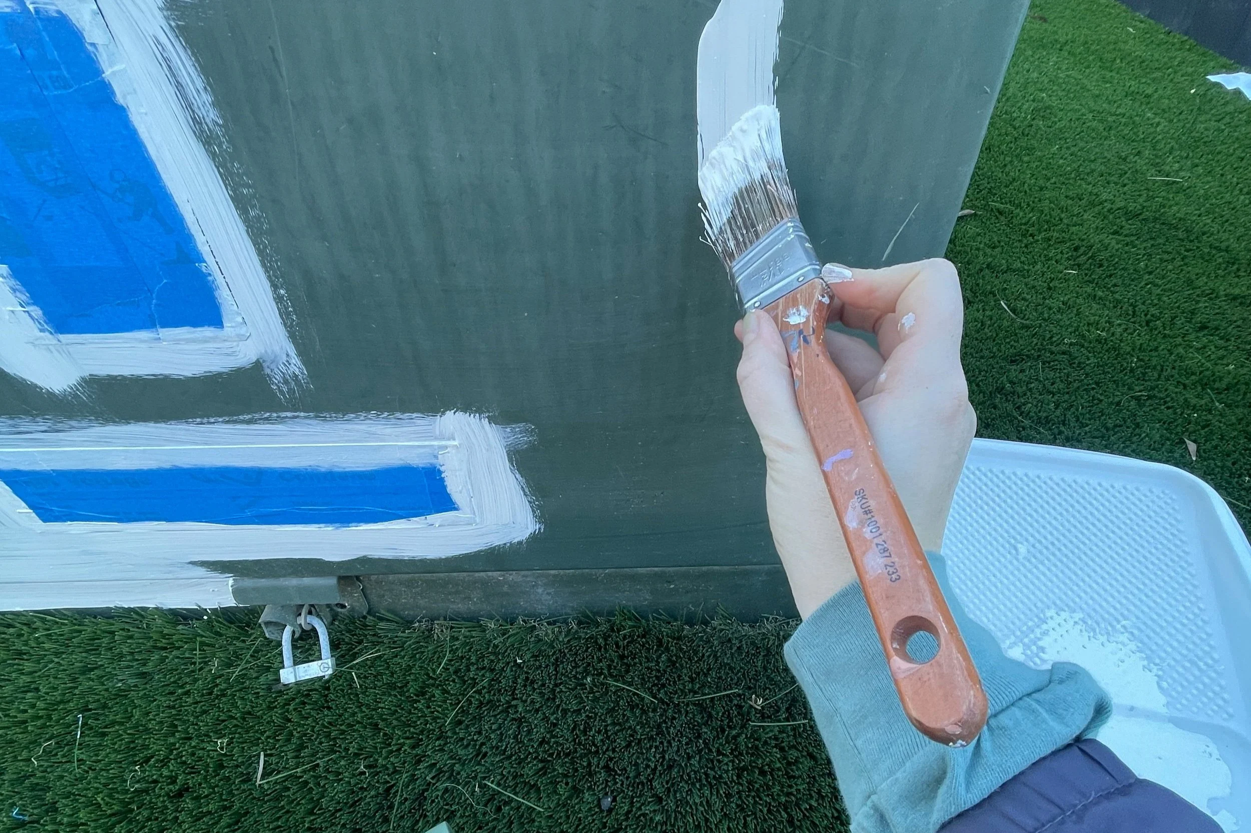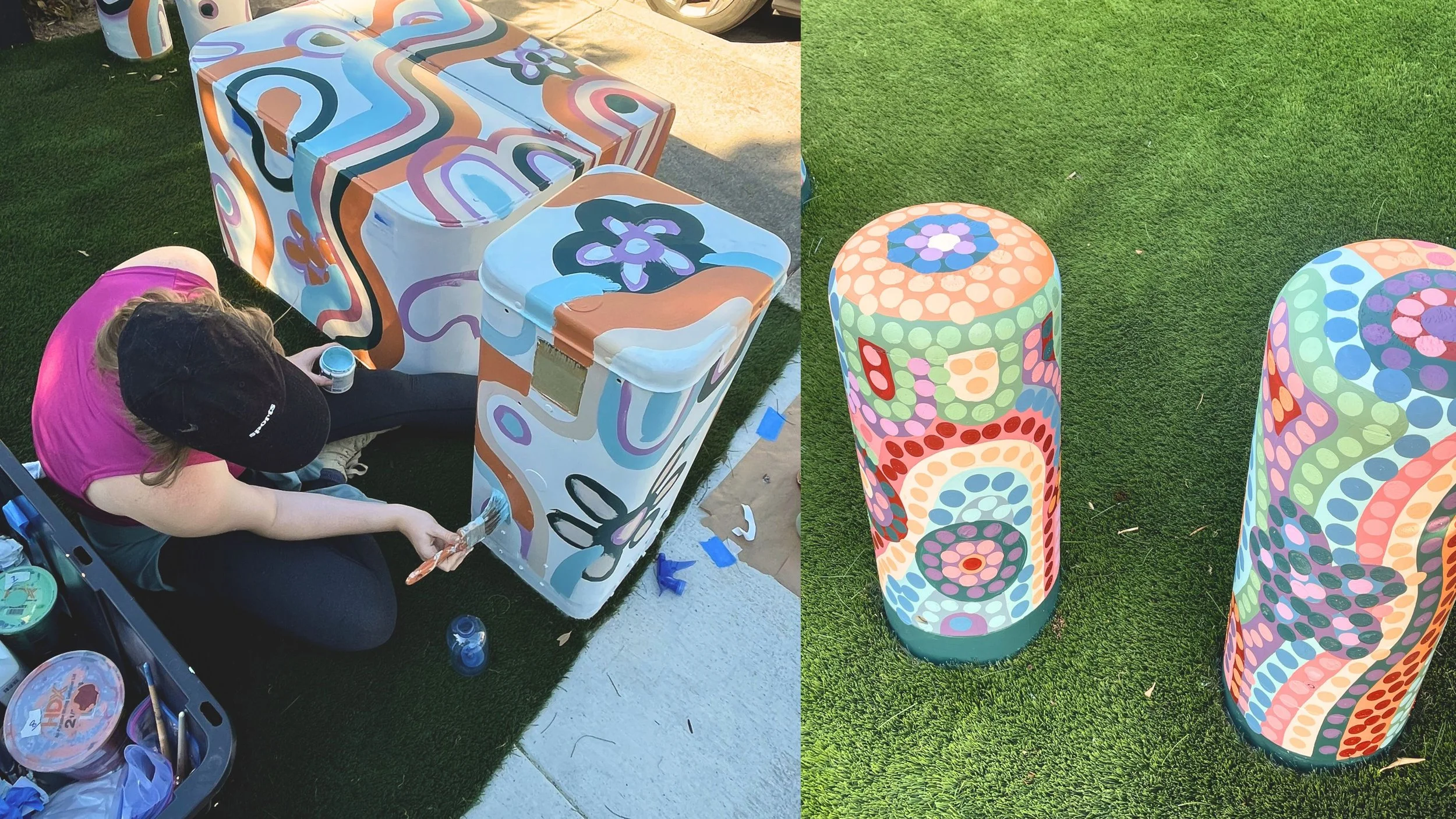 One challenge I didn’t anticipate? The box was surrounded by fake grass. Every other utility box or outdoor mural I’ve done has been next to concrete or solid ground, but this time, when I primed near the grass, the white paint got on it, which was not a good look. I also felt like the white against the grass looked messy, so by the end of the day, I decided to add a dark teal border around the bottom of all the boxes. The client agreed it was a great way to keep the design looking clean.