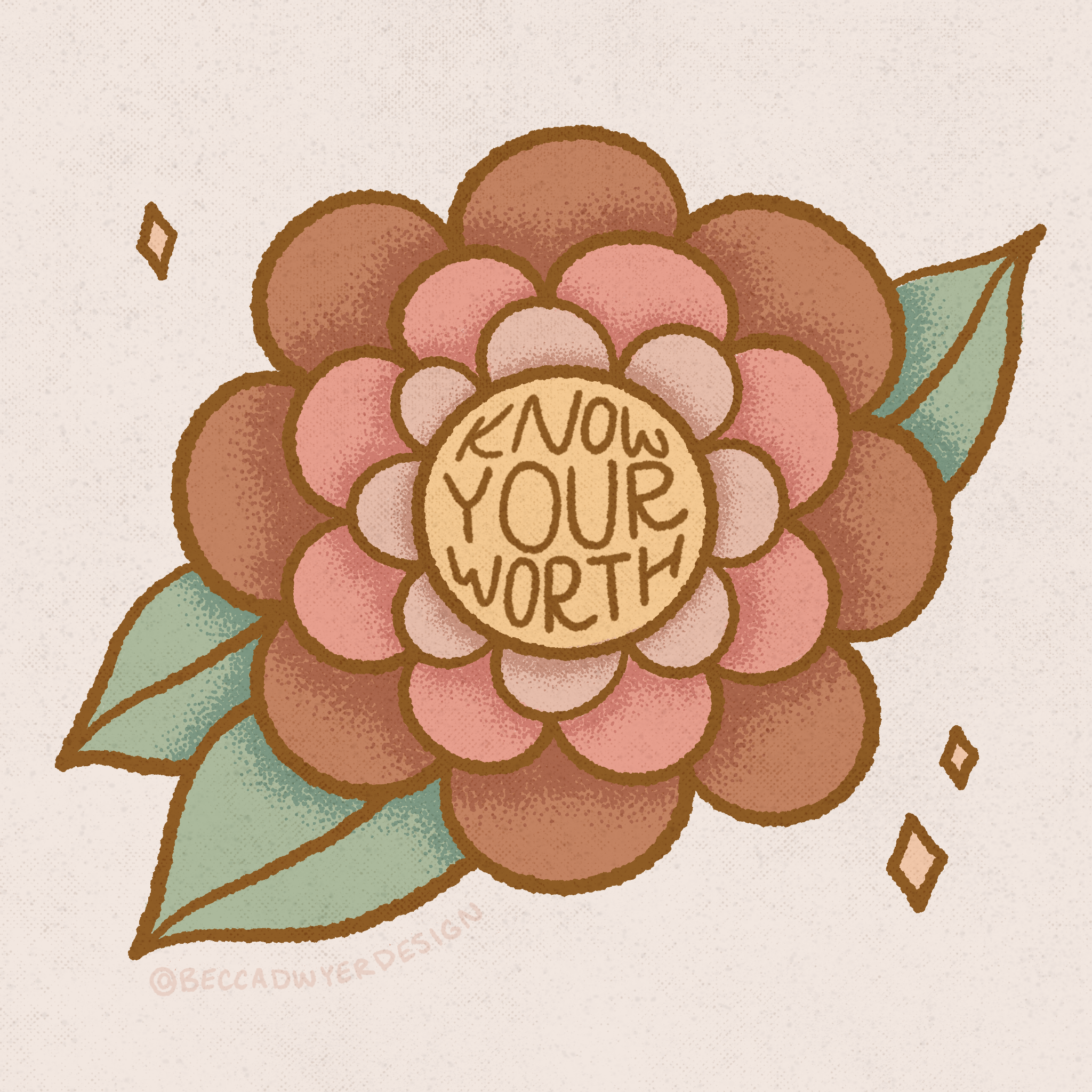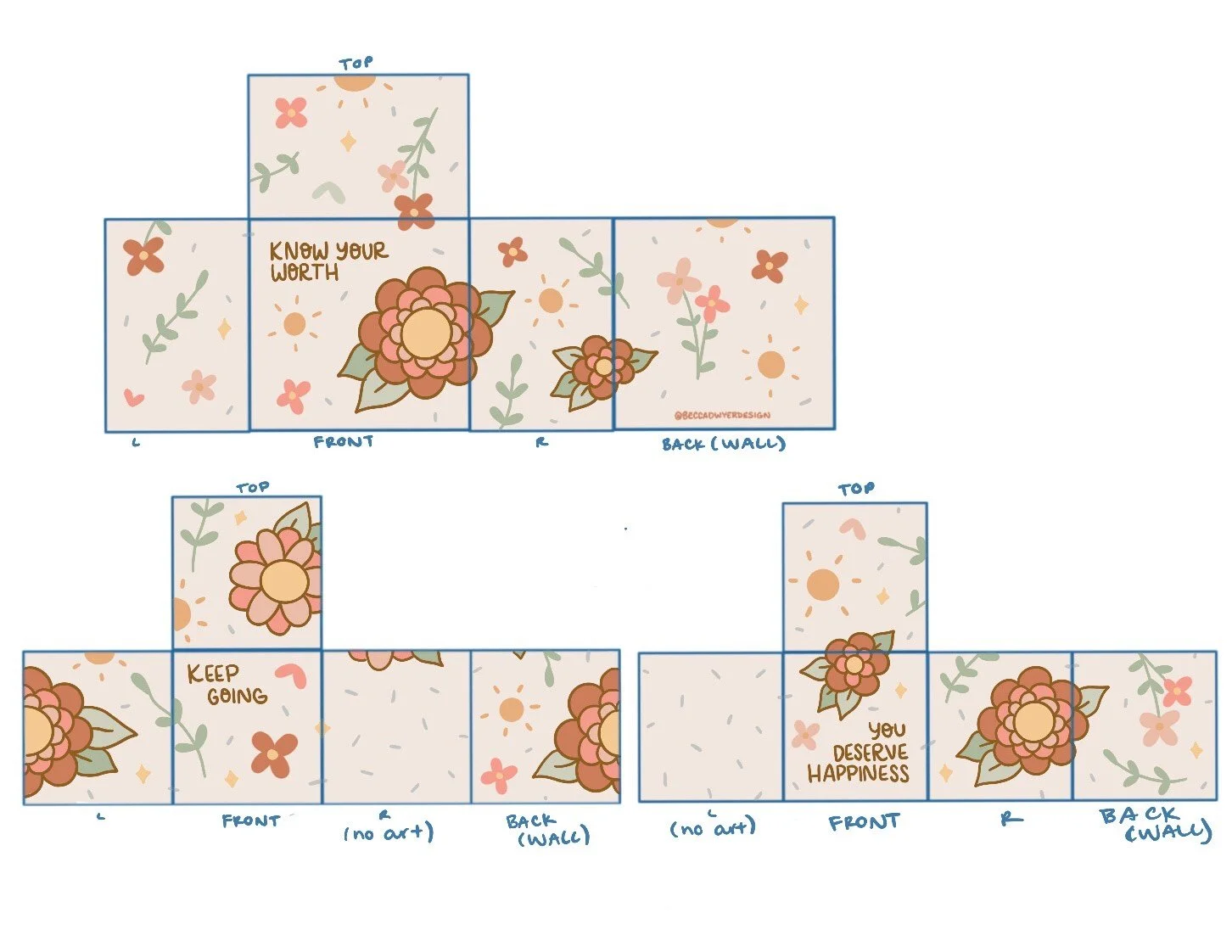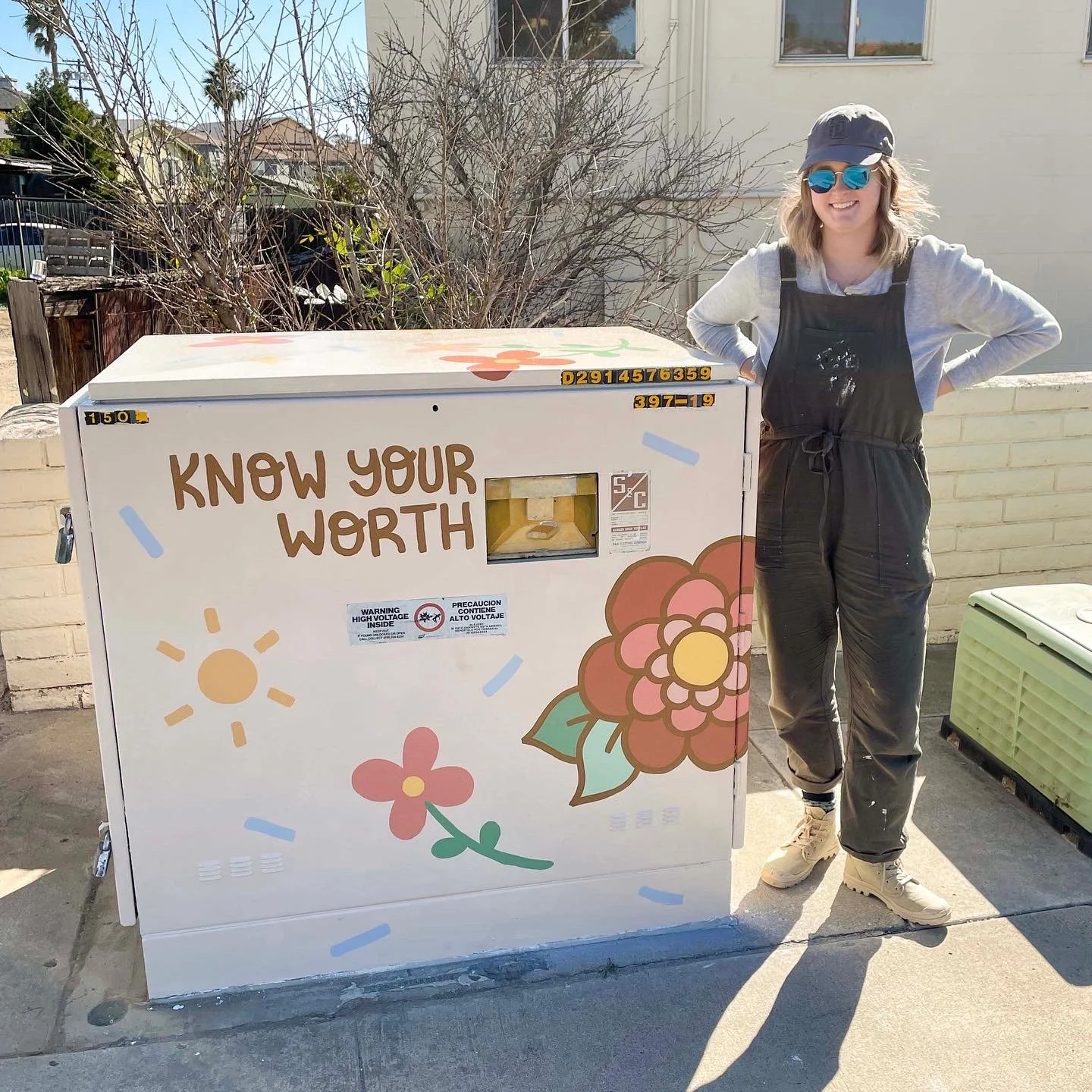 The design for this box was inspired by an illustration I’d drawn about a year prior. The illustration included the phrase “Know Your Worth” and I wanted it to be a reminder for people to value themselves. For this utility box painting, I decided to add the phrases “keep going” and “you deserve happiness”. I wanted the sayings to be short so that people driving by would be able to understand the message.