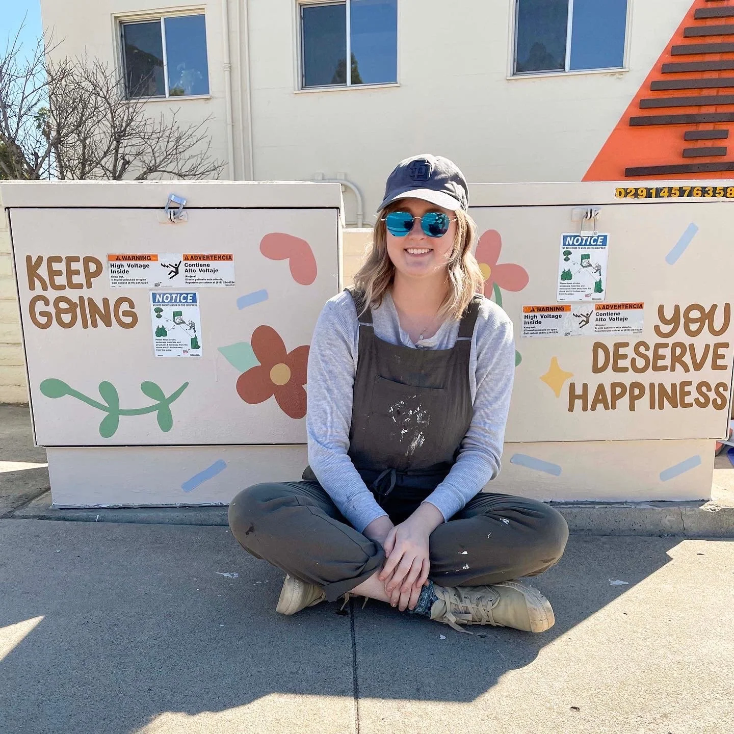 The last words I wrote were my social handle on the bottom and then I went around all the three boxes and filled in empty spots with light blue sprinkles. At this point, I was exhausted but felt satisfied that the paintings were complete! The city of La Mesa requested that I cover the final mural in an anti-graffiti coating, so we had to wait for all of the paint to dry before adding that.