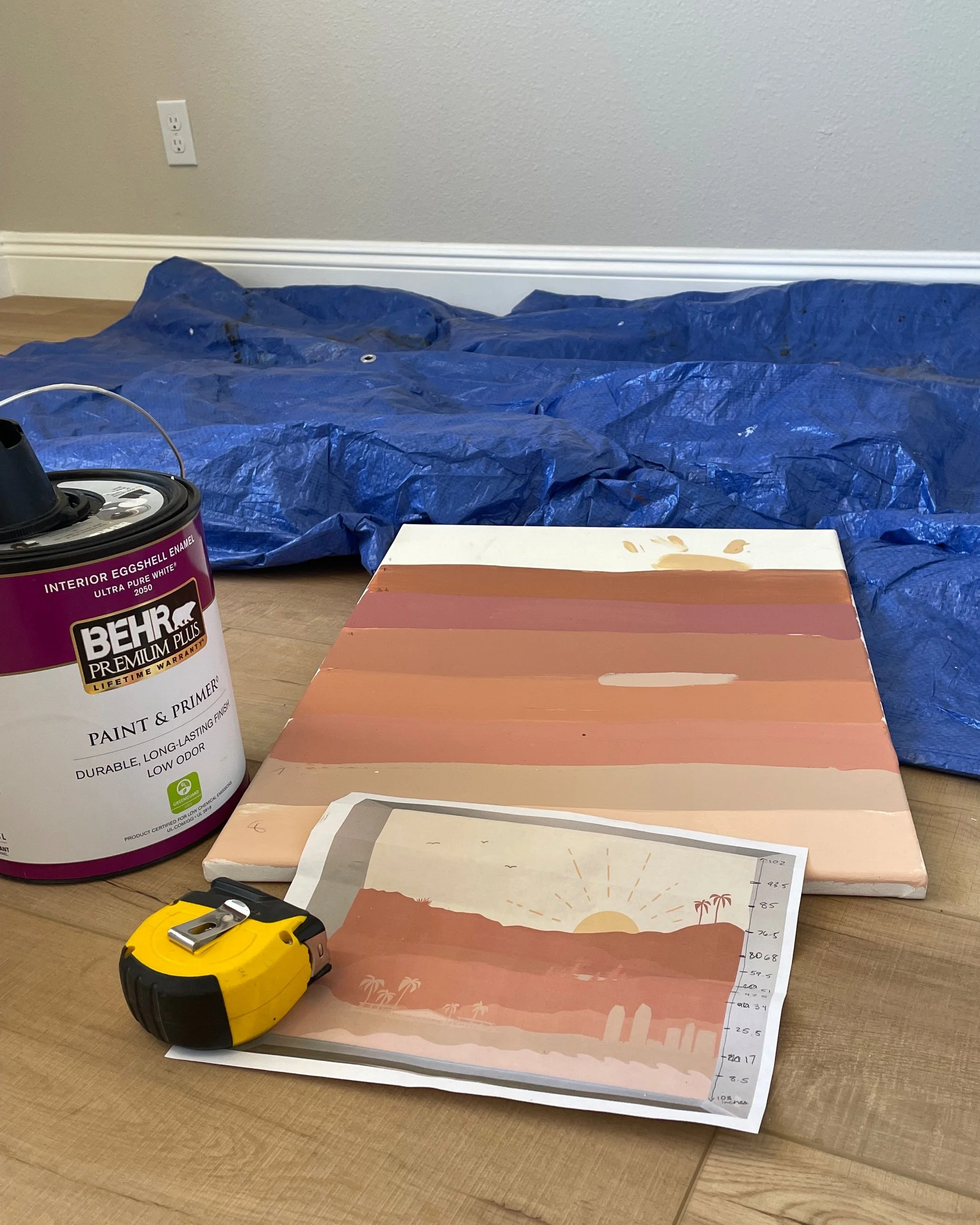 Once home, I started to mix my in-between colors. I bought four quarts of paint but had nine layers of color for my mural, so I used five extra quart containers to mix and store my additional colors. I did this in an attempt to save some money, but in hindsight, buying sample sizes instead of quarts might have made my life easier. Once I mixed each layer to the shade I wanted, I painted swatches onto a small canvas. While that dried, I gathered up all my materials and went straight to my sister’s house. I really wanted to see how the sample colors looked in the actual room because sometimes the amount of light in a space can change the way the colors are perceived.