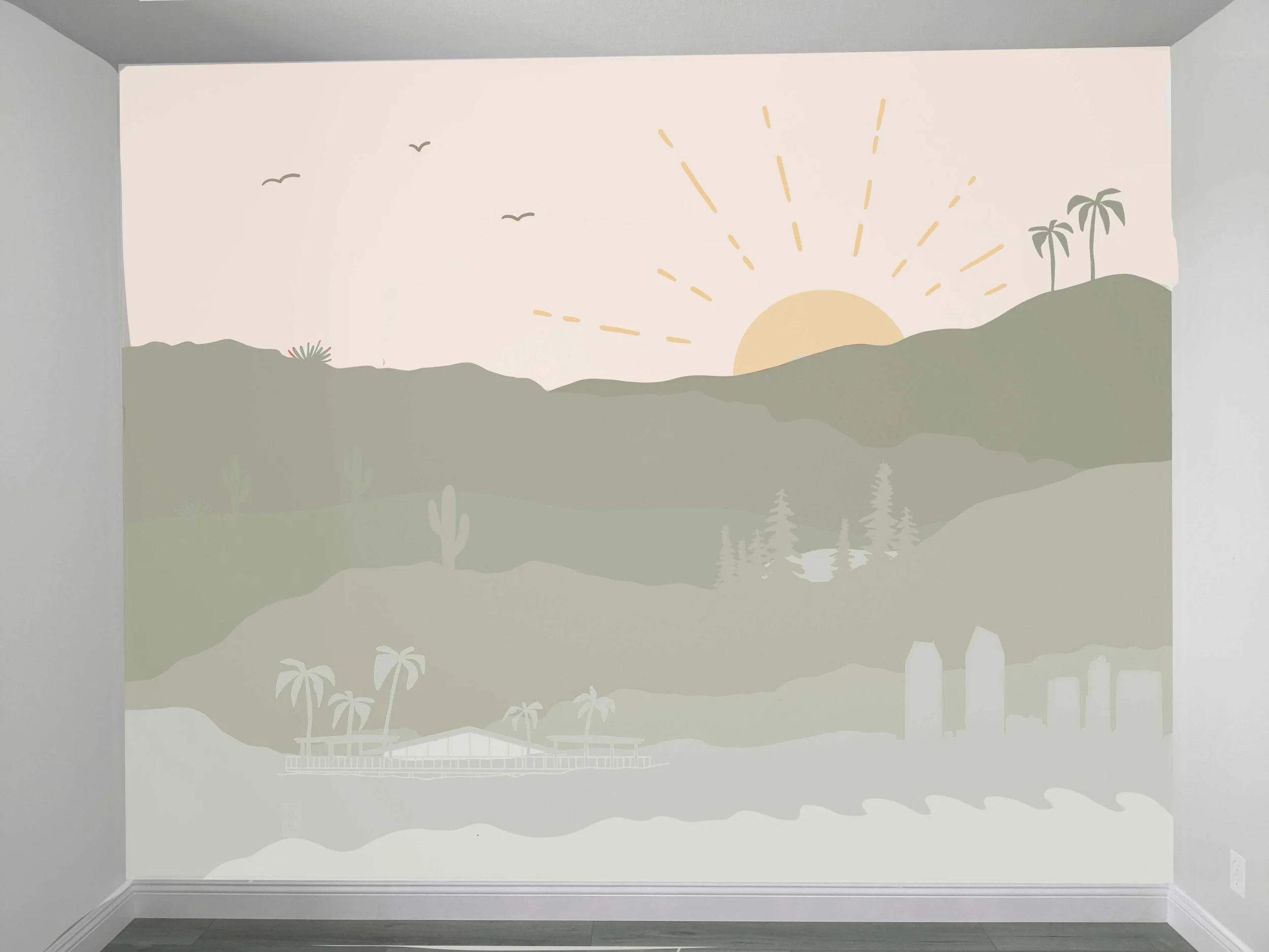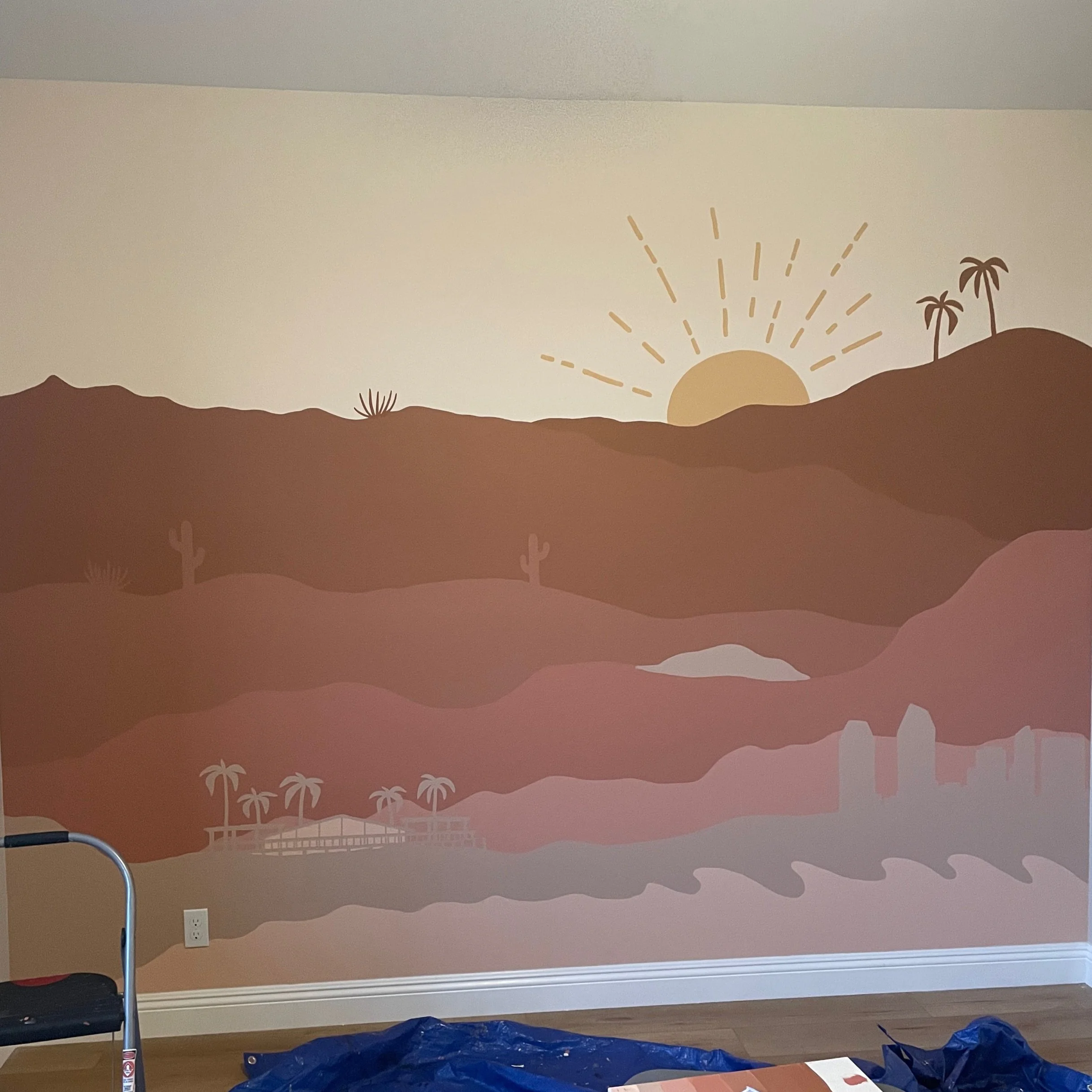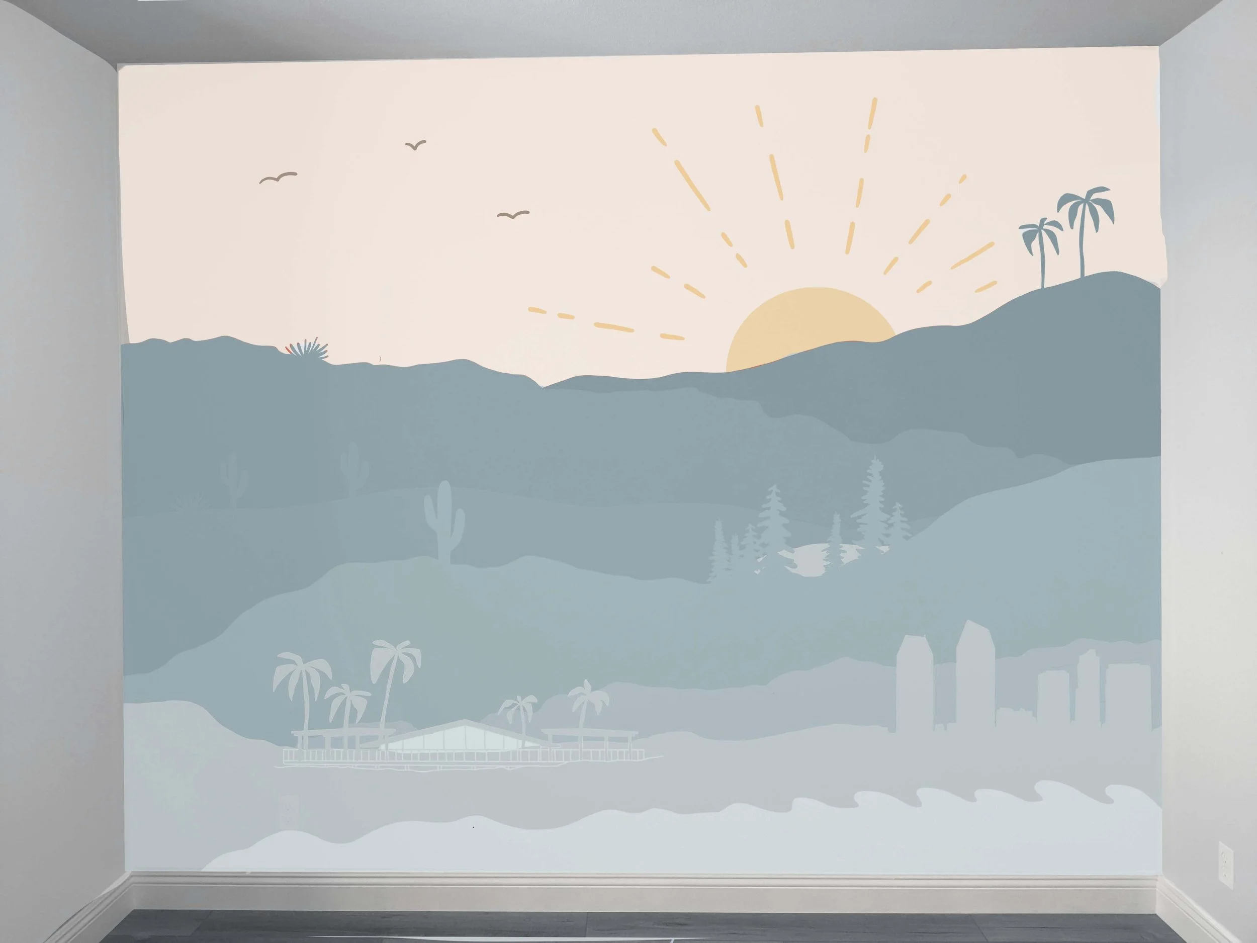 From here, I needed to add in the details. The icons I included were palm trees, cacti, forest trees, a lake, a cityscape, and the place my sister and brother-in-law were married in San Diego. This process usually requires a combination of methods to transfer my intended image onto the wall. For this project, the palm trees required a paper stencil, but the resort and cityscape were achieved with the help of a projector. While some parts of the wall were still drying, my impatient self decided to take off all the blue painter’s tape and pull back the tarp so that I could view the mural in its entirety. If this were a commercial job, I would take all my photos at this point and quickly clean up my materials. But because this was my sister’s place, I snapped a few quick pics and left my mess for another day.