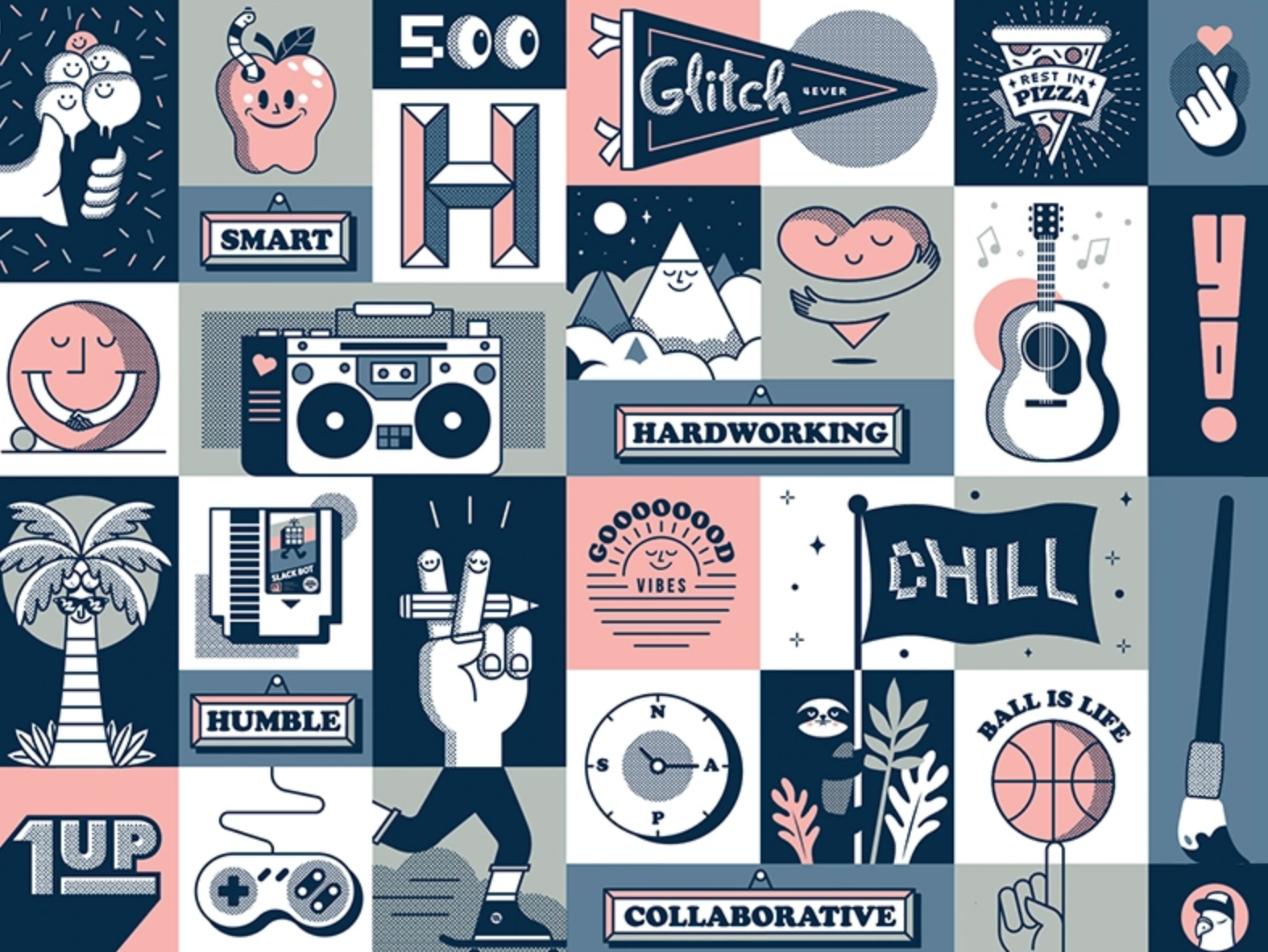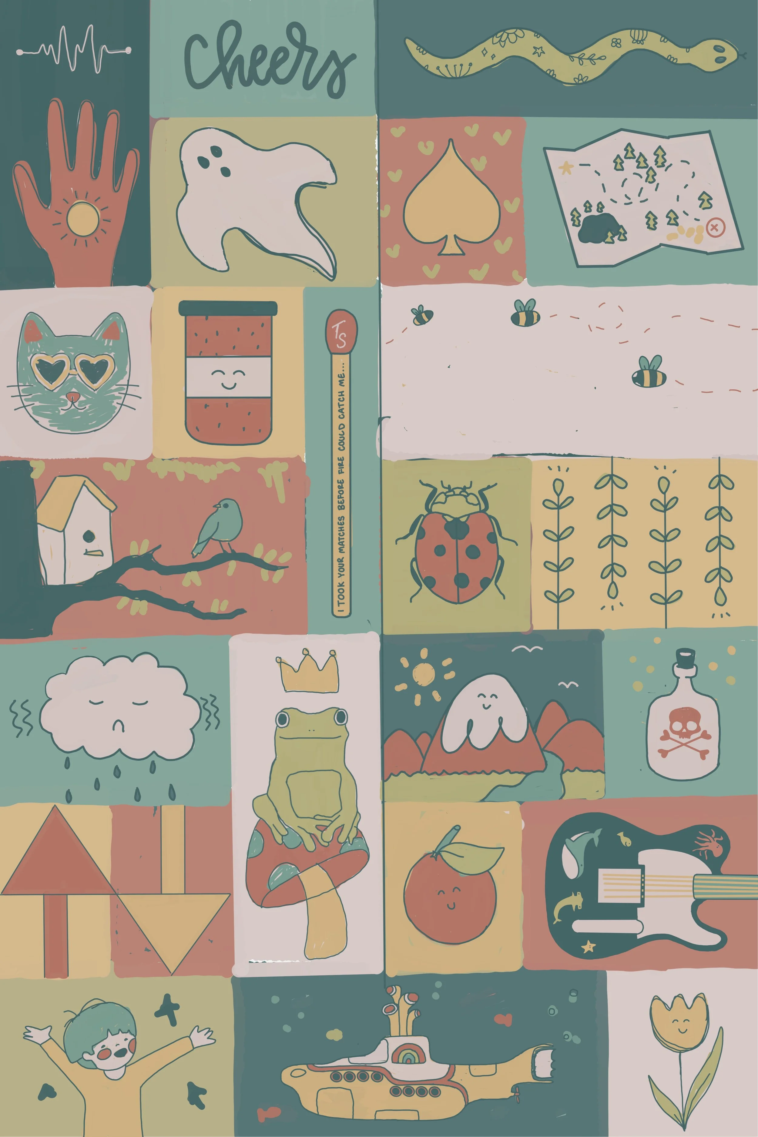 Before starting a project, I like to look for inspiration. It did not take long to find this wonderful creation by Viet Huynh and Nick Slater for Slack. The limited color palette, clean linework, and use of negative space are all elements that inspired me, and I used this as my main source of influence. After finding my inspo, the next thing I did was open Procreate on my iPad to start sketching out ideas. I then divided my canvas into various squares and began sorting out which prompt I would do in each spot. This process involved a lot of push and pull, as I combined a few elements and represented others multiple times.