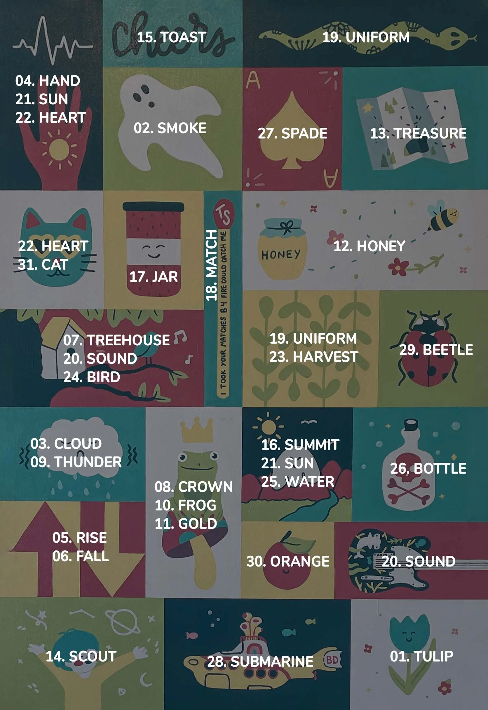 This year, I wanted to do something different. Instead of drawing 31 individual illustrations, I aimed to create one large painting combining all 31 prompts. I wanted to do this for two reasons: I was highly unmotivated to draw 31 full illustrations, and I wanted to create something that would showcase my painting skills. I knew that if I forced myself to try to come up with 31 different drawings, I would burn out quickly. I also recently decided to transition my business into larger paintings and/or murals, so that was the main factor for painting a collage instead of illustrating.