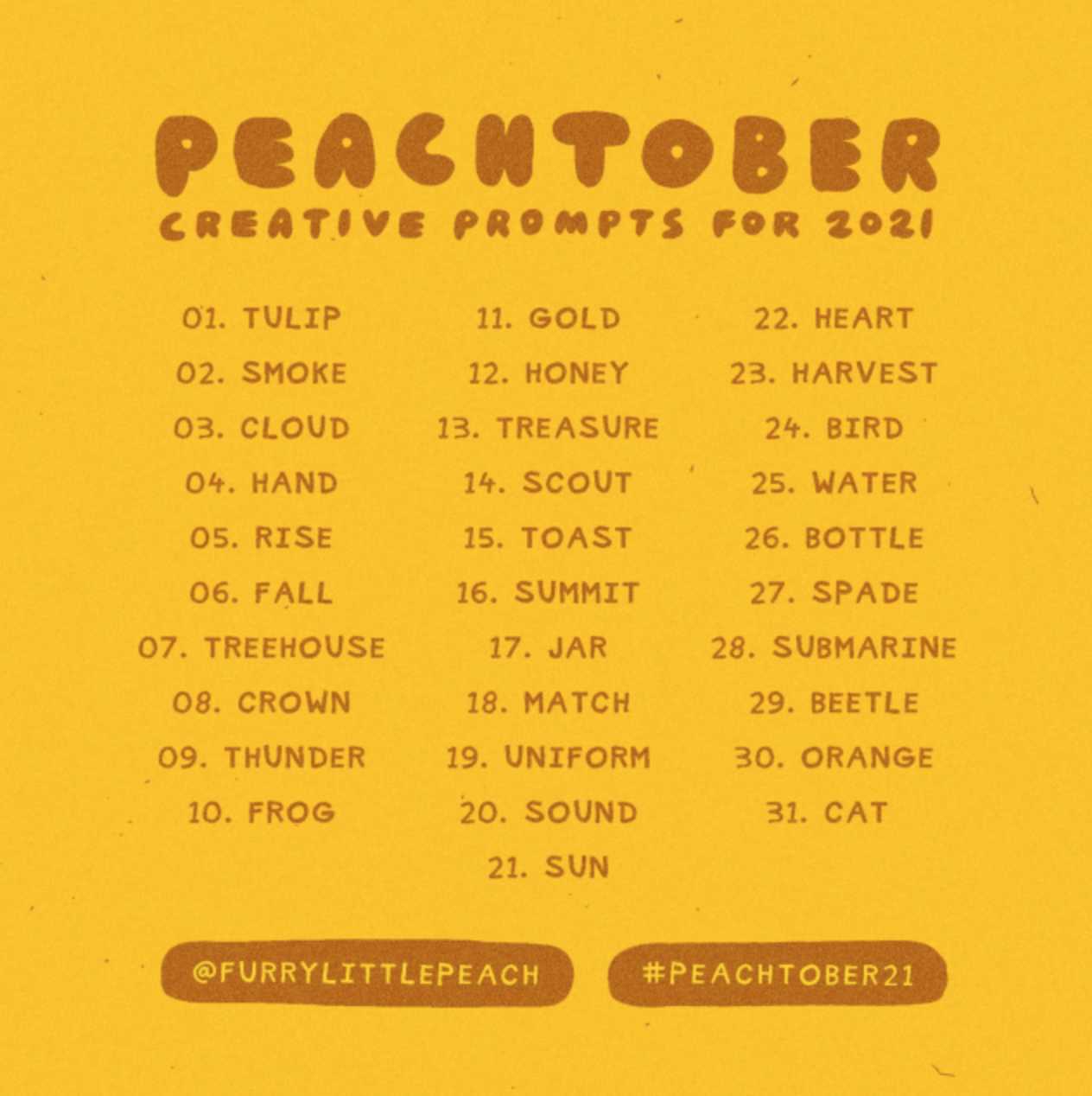 But as Sha’an says every year, there are no rules to Peachtober so… let’s get into it! For reference, here is the prompt list for 2021, including all 31 concepts I attempted to portray in the collage painting.